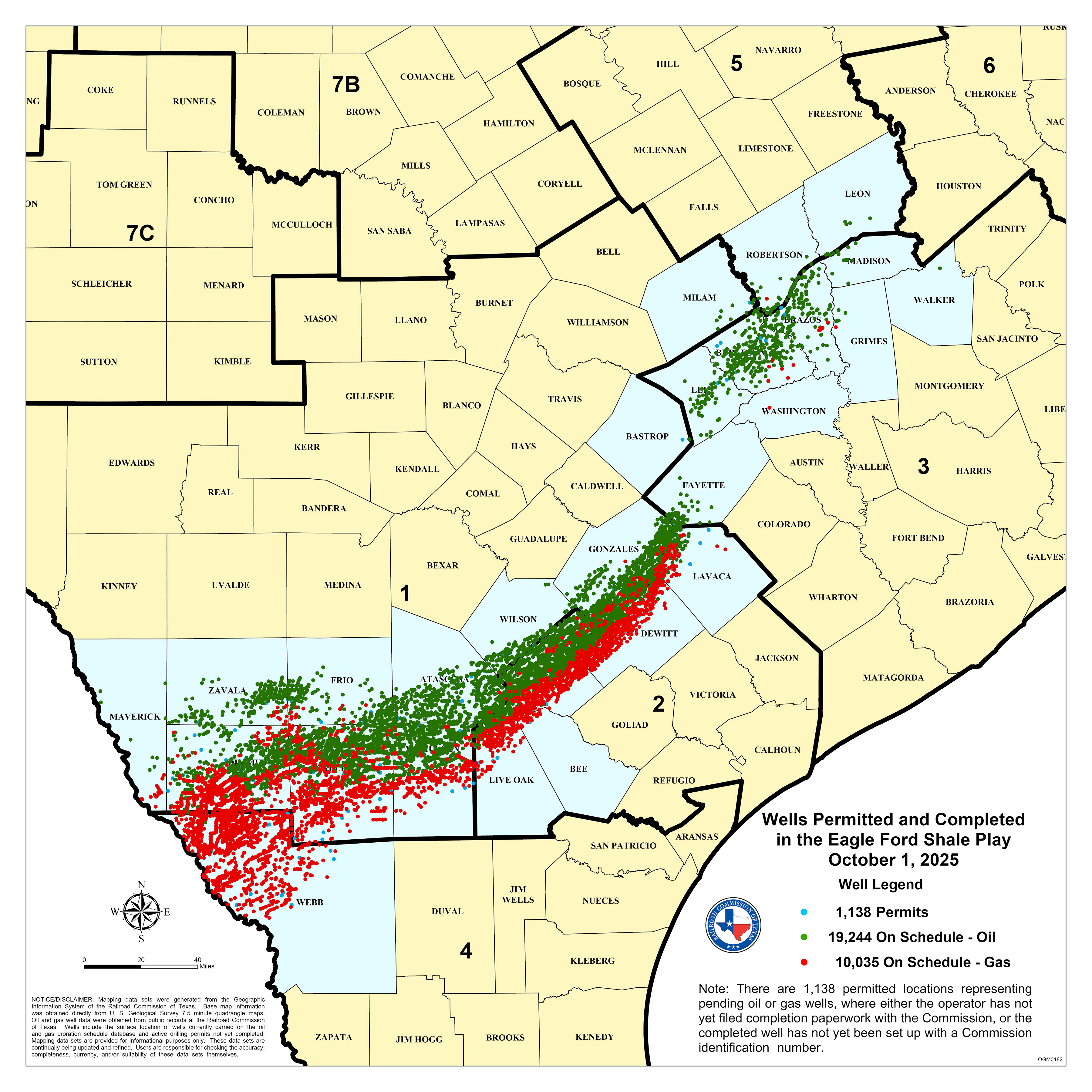 Active permit (blue) and Producing Gas (red) and Oil (green) wells in the Eagle Ford Shale Play area. Commission districts and county boundaries. |